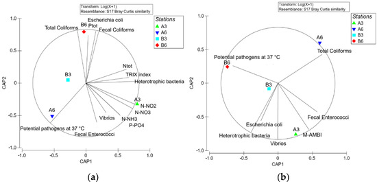 Both trophic state and biological parameters were considered for water environments, and only the latter for the benthic environment. The results from water parameter analysis showed B3 as the site that was least subjected to pollution. In contrast A3 was found to be the most impacted site (Figure 8a), with most of the measured parameters located close to the latter station, except for coliforms, which appeared to be more closely related to Station B6, and potential pathogens with A6. A similar trend was also observed in the CAP analysis relative to the sediment samples, but, showing an inverse trend, with potential pathogens more closely linked to Station B6 and coliforms to A6 (Figure 8b).