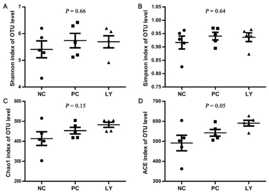 Cecal microbial α-diversity of broilers indicated by Shannon (A), Simpson (B), Chao1 (C), ACE (D) indexes of operational taxonomic unit (OTU) level. NC—negative control, basal diets; PC—positive control, basal diets supplemented with antimicrobials; LY—basal diets supplemented with compound probiotics. Each plot, including the dots, squares, and triangles, in the figure represents one sample.