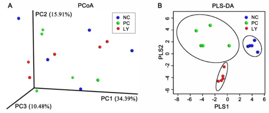 Microbial β-diversity in the cecum of broilers. (A) Principal coordinate analysis (PCoA) of weighted distance calculated from operational taxonomic unit (OTU) abundance matrix. (B) Partial least squares discriminant analysis (PLS-DA). NC—negative control, basal diets; PC—positive control, basal diets supplemented with antimicrobials; LY—basal diets supplemented with compound probiotics.