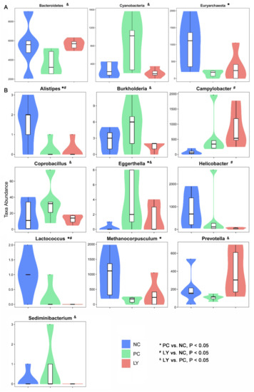Different species at the phylum (A) and genus (B) level in the cecal microbiota of broilers. NC—negative control, basal diets; PC—positive control, basal diets supplemented with antimicrobials; LY—basal diets supplemented with compound probiotics. * significant difference (p < 0.05) between PC and NC groups. # significant difference (p < 0.05) between LY and NC groups. & significant difference (p < 0.05) between LY and PC groups.