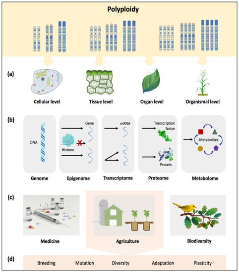 Figure 1. Advances in understanding polyploidy, with its role and implications from cells to ecosystems; (a) polyploidy involves the fusion of two or more genomes within one nucleus, affecting cells, tissues, organs, and organisms; (b) polyploidy as the product of a dynamic process in which restructuring of the genome, epigenome, transcriptome, proteome, and metabolome occurs through various changes; polyploidy as a biological force in (c) various fields and more specifically, (d) agriculture.