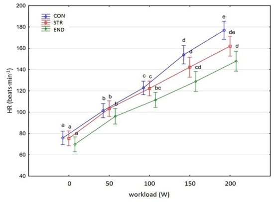 Heart rate (HR) at rest and its response during the progressive exercise test; point and whiskers—mean ± 95% CI; the signs—a, b, c, d, e indicate homogeneous groups (post-hoc Tukey’s HSD test: p > 0.05).