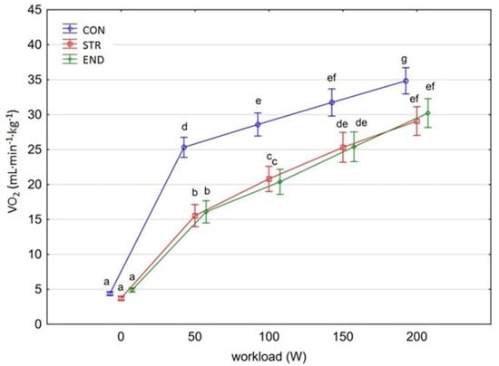 Oxygen uptake (VO2) at rest and its response during the progressive exercise test; point and whiskers—mean ± 95% CI; the signs—a, b, c, d, e, f, g indicate homogeneous groups (post-hoc Tukey’s HSD test: p > 0.05).