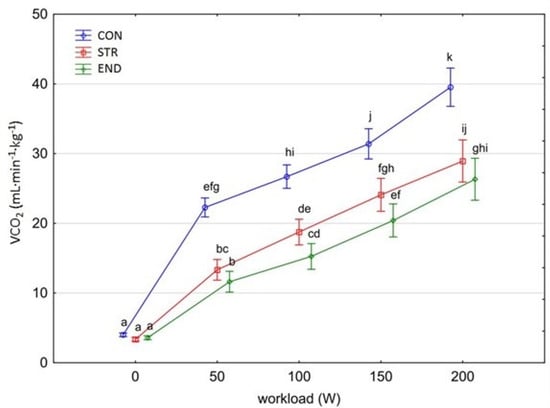 Carbon dioxide production (VCO2) at rest and its response during the progressive exercise test; point and whiskers—mean ± 95% CI; the signs—a, b, c, d, e, f, g, h, i, j, k indicate homogeneous groups (post-hoc Tukey’s HSD test: p > 0.05).