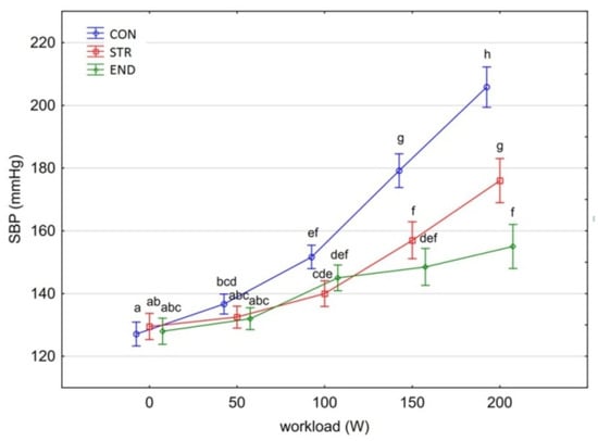 Systolic blood pressure (SBP) at rest and its response during the progressive exercise test; point and whiskers—mean ± 95% CI; the signs—a, b, c, d, e, f, g, h indicate homogeneous groups (post-hoc Tukey’s HSD test: p > 0.05).