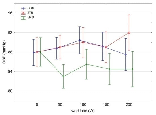 The variation of SBP in the studied groups depended on the workload level [F(4,116) = 307.062, p < 0.001, η2p = 0.914].In the groups of athletes, there were no significant differences at rest, the SBP did not increase significantly with the workload of 50 W (Tukey’s HSD test: p = 0.991), and in the STR group also with the workload of 100 W (Tukey’s HSD test: p > 0.444) (Figure 4). The increase in workload, 150 W and 200 W, significantly increased SBP in the END and STR groups compared to SBP measured at lower workloads (Tukey’s HSD test: p < 0.003). Systolic blood pressure was generally higher in the STR group and increased significantly with increased workloads (150 W vs. 200 W: Tukey’s HSD test: p = 0.0001). The values of SBP in the END group did not differ significantly at higher workloads (HSD Tukey’s test: 100 W vs. 150 W, p = 0.998; 150 W vs. 200 W, p = 0.683).