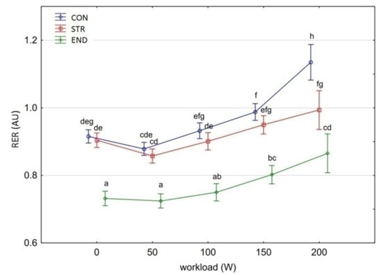 There was a significant main effect for group in the average RER [F(2,29) = 101.560, p < 0.001, η2p = 0.875]. Pairwise comparisons demonstrated a significantly lower RER at rest and at all workloads for the END group compared to the other groups (Tukey’s HSD test: END vs. STR, p = 0.0001; END vs. CON, p = 0.0001) (Figure 6). There was no difference in RER between the CON and STR groups in the workload from baseline to 150 W (Tukey’s HSD test: p > 0.946). The RER at 200 W was significantly higher in the CON group (Tukey’s HSD test: p = 0.0001). RER differences in all groups also depended on the workload level [F(4,116) = 76.910, p < 0.001, η2p = 0.726].