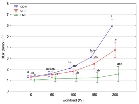 Blood lactate (BLa–) at rest and its response during the progressive exercise test; point and whiskers—mean ± 95% CI; the signs—a, b, c, d, e, f indicate homogeneous groups (post-hoc Tukey’s HSD test: p > 0.05).