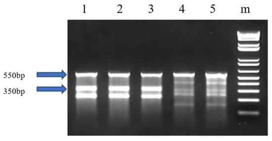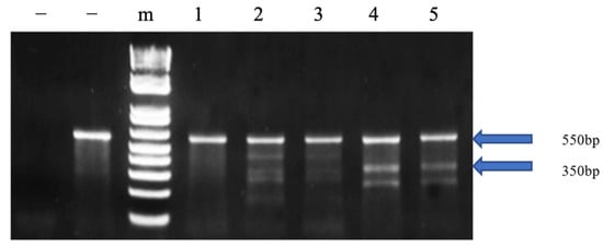 Identification of edited catfish-type gonadotropin-releasing hormone (cfGnRH) gene in F1 channel catfish (Ictalurus punctatus) using the Surveyor mutation detection assay. The negative control is not shown in this image. “m” indicates 1 kb DNA ladder; 1, 2, 3, 4 and 5 are channel catfish with mutation. Figure 5 was cropped from the full-length gels that were presented in Figure S4.