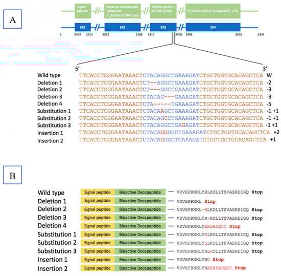 Nucleic acid sequences and corresponding predicted amino acid sequences of catfish-type gonadotropin-releasing hormone (cfGnRH) gene in wild-type channel catfish (Ictalurus punctatus) and after edited with transcription activator-like effector nucleases (TALENs). (A) EX1…EX4 indicate exon1…exon4. The wild-type channel catfish cfGnRH gene sequence is shown on the top. Sequences in orange are the target binding sites of the TALENs. Sequences (blue highlighted) in the middle portion of gonadotropin-releasing hormone associated peptide (GAP) are the expected cleavage sites of the nucleases. Red dashes and letters indicate the deletion, insertion/substitution of nucleotides. Numbers at the end of the sequences show the number of nucleotides deleted (−) or inserted (+) in the edited cfGnRH gene. (B) Predicted amino acid sequences with incomplete domain were due to frame-shift reading, resulting in a premature stop (red color) codon. Single amino acid substitutions or deletions (red color) were due to single nucleotide substitution mutation or three nucleotides deletion.