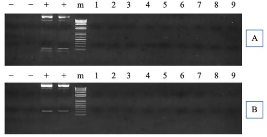 Polymerase chain reaction (PCR) inspection of potential transcription activator-like effector nuclease (TALEN) plasmid integration into channel catfish (Ictalurus punctatus) genome. In (A,B), the left lanes of “−” indicate the negative controls without template, while the right lanes of “−” indicate the negative controls with wild-type channel catfish DNA as a template; “+” indicates the positive controls with left and right TALEN plasmids as a template, respectively; “m” indicates 1 kb DNA ladders. Numbers represent samples from channel catfish individuals carrying mutated cfGnRH gene; the same number indicates the same individual in (A,B). (A,B) represent the PCR detection with different specific primers designed to amplify the cytomegalovirus (CMV) promoter region and the transcription activator-like (TAL) repeats region, respectively. (A,B) were cropped from the full-length gels that were presented in Figure S3.