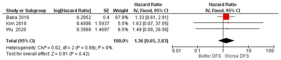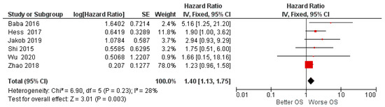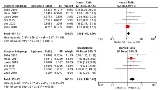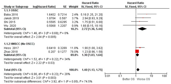 | Wu (2020) [48] | China | RT | 62 (42, 20); S (46, 16). | 60 months | OSCC | median | miR-155. | OS:HR 1.6600 p = 0.6780 1 DFS:HR 1.4900 p = 0.7861 1 |