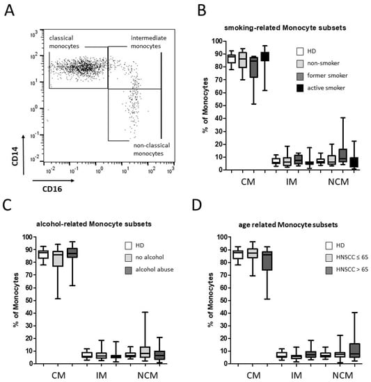 Flow cytometric analysis of CD14 and CD16 characterized monocyte subsets. (A) Representative example gating scheme of peripheral monocyte subset analysis by flow cytometry. (B) Whole blood analysis revealed similar median abundances of classical monocytes (CM), intermediate (IM), and non-classical monocytes (NCM) in non-smoking, former-smoking, and active-smoking HNSCC patients as well as in alcohol associated HNSCC patients (C) and age-related individuals (D) compared to healthy donors, but stronger dispersions of monocyte subset distributions in cancer patients.