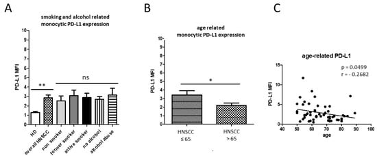 Flow cytometric analysis of PD-L1 expression. (A) HNSCC patients (n = 64) revealed significantly increased expression levels of monocytic PD-L1 compared to healthy donors, but no significant differences between the smoking- and alcohol-related subgroups (** p < 0.01; ns = not significant). (B) HNSCC patients ˃ 65 revealed significantly decreased expression levels of monocytic PD-L1 compared to HNSCC patients ≤ 65 (* p < 0.05). (C) Correlation analysis between monocytic PD-L1 expression and age of HNSCC patients revealed a significant negative correlation. The Pearson correlation coefficient (r) and p values are given. p < 0.05 was considered as significant.