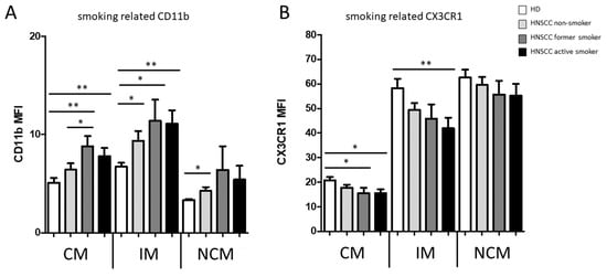 Furthermore, we observed significantly increased expression of monocytic CD11b in all analyzed monocyte subsets compared to healthy donors with an increased significance in smoking-related HNSCC patients. It has been shown in mice that cigarette smoke exposure modified the composition of pulmonary macrophages by expanding CD11b+ subpopulations including monocyte-derived alveolar macrophages []. In addition, increased surface expression of CD11b was observed in smokers with chronic obstructive pulmonary disease (COPD) compared to non-smokers []. Taken together, these data suggest that cigarette smoke exposure leads to immune alterations of circulating myeloid cells which correspondingly results in altered compositions of tissue infiltrating macrophage subpopulations. Besides its function as a leukocyte adhesion molecule, integrin CD11b has also been shown to act as a suppressor of immune responses in myeloid cells [,,].