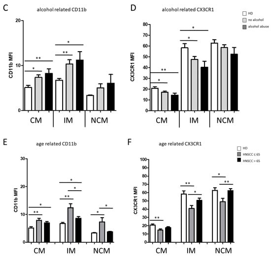Flow cytometric analysis of monocytic CD11b and CX3CR1 expression in classical monocytes (CM), intermediate monocytes (IM), and non-classical monocytes (NCM) in PBMC from healthy donors and HNSCC patients. (A) Active-smoking HNSCC patients revealed significantly increased expression levels of monocytic CD11b compared to healthy donors. (B) HNSCC patients revealed significantly decreased expression levels of monocytic CX3CR1 in classical monocytes and intermediate monocytes from active-smoking patients compared to healthy donors. (C) HNSCC patients revealed significantly increased expression levels of monocytic CD11b compared to healthy donors. (D) HNSCC patients revealed significantly decreased expression levels of monocytic CX3CR1 in classical monocytes and intermediate monocytes compared to healthy donors. (E) HNSCC patients ≤ 65 revealed significantly increased expression levels of monocytic CD11b compared to healthy donors and HNSCC patients ˃ 65. (F) HNSCC patients ≤ 65 revealed significantly decreased expression levels of monocytic CX3CR1 compared to healthy donors and HNSCC patients ˃ 65. * p < 0.05; ** p < 0.01.