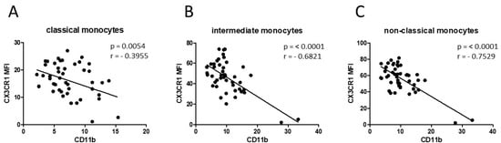 Similar results were obtained from the analysis of alcohol-abusing HNSCC patients compared to healthy donors (Figure 3C). Conversely, our data revealed significantly decreased expression levels of CX3CR1 on intermediate monocytes in active-smoking HNSCC patients compared to healthy donors (Figure 3B,D). In view of older HNSCC patients, data revealed an inverse regulation with significantly decreased expression of monocytic CD11b and increased expression of CX3CR1 in older HNSCC patients compared to the cohort of HNSCC patients ≤ 65 years of age (Figure 3E,F). A subsequent correlation analysis between monocytic CD11b and CX3CR1 expression of HNSCC patients revealed an overall highly significant negative correlation in all three monocyte subsets (Figure 4).