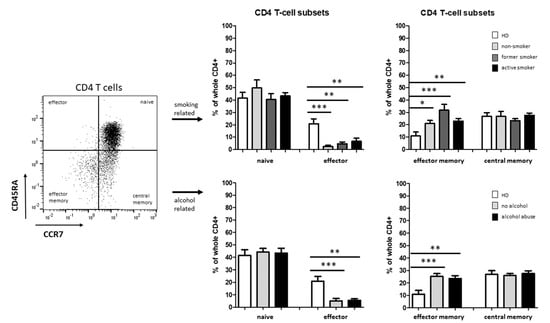 Flow cytometric analysis of CD4+ T-cell subsets in PBMC from healthy donors as well as smoking and alcohol-abusing HNSCC patients. Example gating scheme and percentages of naïve, effector, effector memory, and central memory T cells within CD4+ T cells. * p < 0.05; ** p < 0.01; *** p < 0.001.