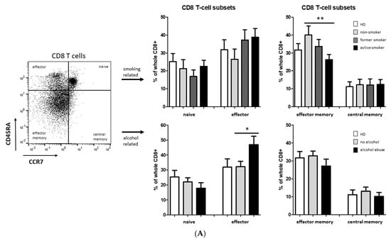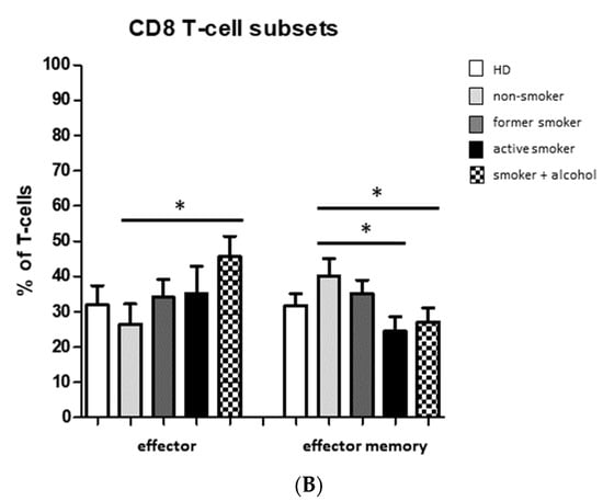 Remarkably, significantly increased levels of CD8+ effector T cells and decreased CD8+ effector memory T cells were found in active-smoking and alcohol-abusing HNSCC patients compared to non-smoking/non-drinking patients.