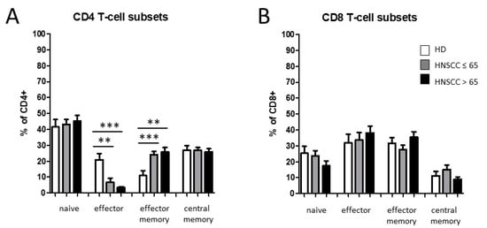 Flow cytometric analysis of CD4+ and CD8+ T cells in PBMC from healthy donors and HNSCC patients of two age-related cohorts (≤65 and ˃65 years of age, respectively). (A) Percentages of naïve, effector, effector memory, and central memory T cells within CD4+ T cells. (B) Abundances of naïve, effector, effector memory, and central memory T cells within CD8+ T cells. ** p < 0.01; *** p < 0.001.
