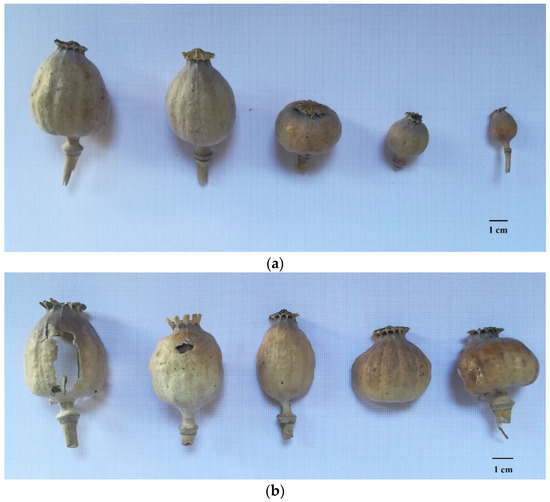 The major alkaloid present in the opium poppy is generally morphine, followed by noscapine, codeine, thebaine and papaverine [2,10,11]. Some exceptions have been published in literature reporting noscapine, papaverine, or codeine as the major component of these subspecies [2,12]. This variation in morphine concentration may occur due to losses related to leaching, the fungal and enzymatic degradation of alkaloids, or wet and cold weather during maturation [2,13,14]. The variability of the alkaloid content in the opium poppy depends on several factors, such as its region of origin [15,16], climate conditions (e.g., temperature, light conditions) [16], plant cultivar [3,17], vegetation stage [3,18], and the different plant parts examined (the stem diameter, peduncle length, and plant height) [3]. Changes in the content of alkaloids are also derived from capsules’ sizes, the status of conservation (dry or fresh), the presence of seeds or incisions [1,15], and the number of incisions made to extract the opium.