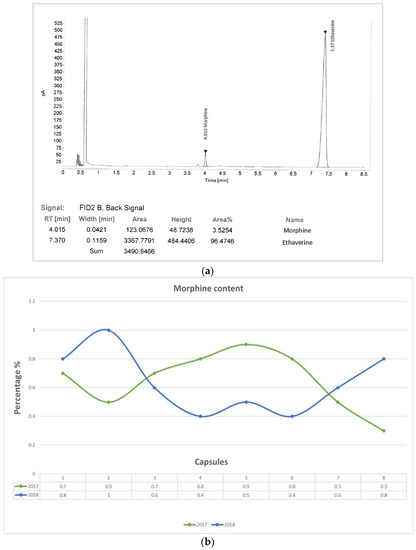 GC-FID chromatogram of the poppy extract (a) and a graphical representation of the morphine content variability in the analyzed samples (b).