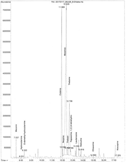 A representative image of the total ion chromatogram concerning the poppy alkaloids extracted from the samples is shown in Figure 3. Codeine and thebaine were the most abundant alkaloids. Meconin, hydrocotarnine, neopine, laudanosine, and noscapine were also detected, together with traces of papaverine.