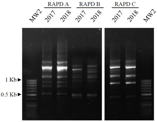 In order to further check the similarity of the 2017 and 2018 plant DNAs (Figure 4), three RAPD assays (A, B and C) were performed. As is detectable in Figure 5, the RAPD profiles (6 bands in assay A, 8 in assay B, and 9 in assay C) of the two samples always showed the same patterns, indicating that their genomes were identical.