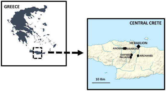 The field study was carried out in central Crete, Greece, in both the town of Heraklion and a few surrounding rural villages (Figure 1).