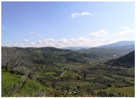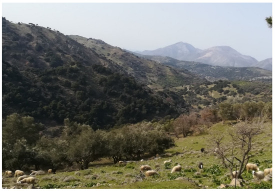 The rural landscape is characterized by typical olive orchards and vineyards at lower altitudes and by shrublands, pastures, and sheep herding at higher altitudes (Figure 2 and Figure 3); the local economy is based on small-scale farming and tourism.
