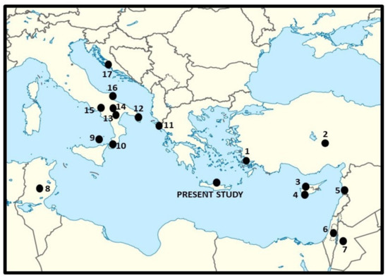 Moreover, the current data were compared with local food uses of WGs recorded in the past three decades during field investigations conducted in other Eastern and Central Mediterranean areas (Figure 4 and Table 1), i.e., Aegean Turkey [13,43,44], Cyprus [14,45], coastal Syria [46], Palestine [47], Western Jordan [48], Tunisia [49], Southern Italy [7,17,18,20,50], Greece [28], and Dalmatian Croatia [8]. We deliberately avoided considering national or large regional reviews on wild food plants, whose primary sources were unclear and/or possibly not based on genuine ethnography and modern ethnobiological methods, i.e., without any evidence of face-to-face interviews with locals and very sound documentation of local plant names.