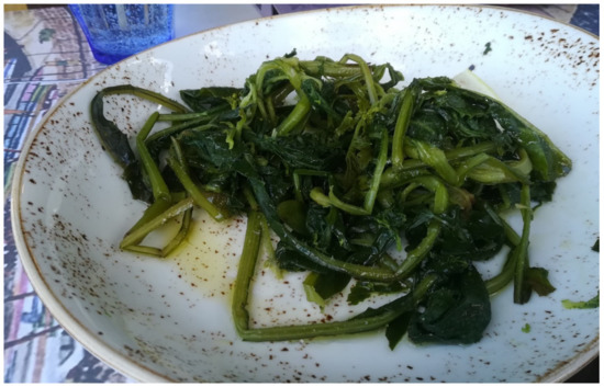 Locals group Chorta according to their culinary processes and especially maintain the very popular category of Vrasta (wild greens consumed boiled with lemon and olive oil, Figure 5) and that of Tsigariasta or Tsiagiasta (wild greens fried in a pan and mainly later used as a filling for pies: phyllo-based pita—chortopita—and stuffed dough that is fried or baked—kalitsounia).