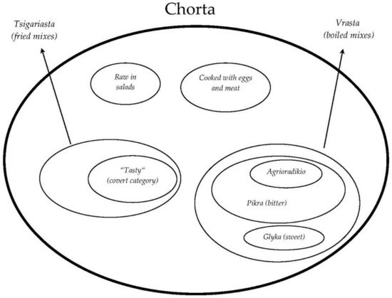 In Figure 6 we represent the folk categorization of Chorta, reporting in brackets some examples of prototypical botanical genera (see the following Table 2 for botanical details).