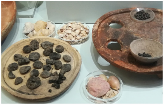 Carbonized Cretan figs, olives, and diverse shellfish, about 1500–1600 BC, Hagia Triada site, Heraklion Archaeological Museum.