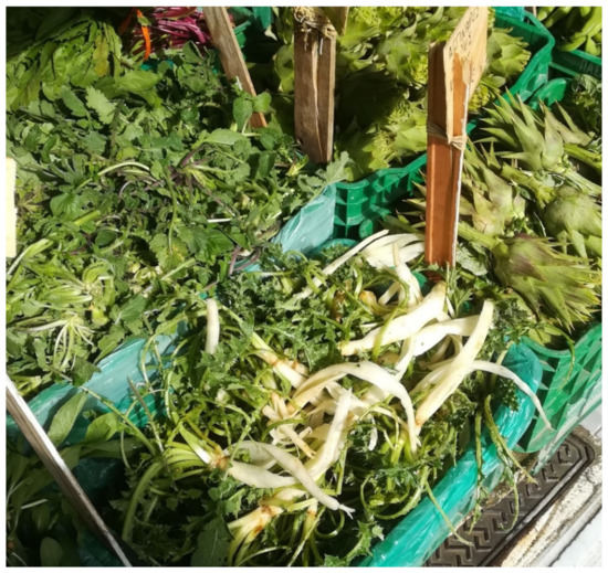 Similarly, von Heldreich [27] classified the wild greens used by Greeks into three main categories: (a) Lahana—those wild greens, mainly bitter Asteraceae, which represent proper vegetables and the pillar of local sustenance (in turn grouped into those considered the best ones and those considered of secondary quality and only occasionally gathered); (b) wild greens predominately used raw as appetizers (mainly Brassicaceae); and (c) wild vegetable snacks, mainly consumed for leisure (green wild Fabaceae fruits, wild artichokes, garlic, Crocus spp. corms, Scorozonera roots, and young shoots of wild asparagus, Dioscorea, Smilax, and Ruscus spp.).