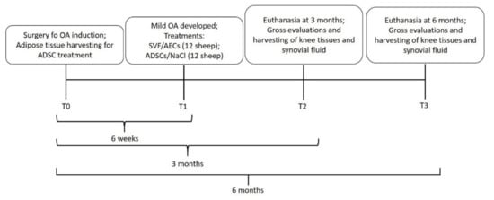 To avoid the risks related to ADSCs, other two cell sources, SVF and AECs, were investigated, and the results were compared with those of ADSCs. The potential of minimal adipose tissue manipulation over cell expansion was recently documented in a rabbit OA model [], and in a preliminary study [] in sheep comparing the effects of the same three cellular treatments. In this last study, the results at 3 months showed no severe degeneration, and improvements in terms of macroscopic cartilage surface and reduction in pro-inflammatory cytokines in the synovial fluid, by all treatments. In addition, SVF highlighted the best performance while ADSCs were the worst [].