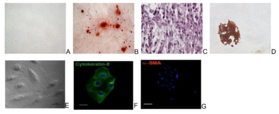 Microscopic images of sheep ADSCs cultured in normal (A), osteogenic (B), chondogenic (C), and adipogenic (D) media for the three lineages differentiation test. Magnification ×4. Representative images of in vitro cultured AECs displaying a polyhedral phenotype (phase contrast) (E), cytokeratin 8 positivity (green color) (F), and alpha SMA negativity (G). Nuclei were counterstained with DAPI (blue color). Scale Bars: 10 μm for phase contrast and cytokeratin 8 images, and 50 μm for alpha SMA image.
