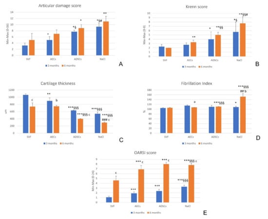 Mean and standard deviation (SD) of macroscopic score (A), Krenn score (B), cartilage thickness (CT) (µm) (C), fibrillation index (FI) (%) (D), and OARSI score (E), for all treatment groups: SVF, AECs, ADSCs and NaCl, at 3 and 6 months. N = 6. *, p < 0.05; **, p < 0.005; ***, p < 0.0005: SVF vs. AECs, ADSCs and NaCl. §, p < 0.05; §§, p < 0.005; §§§, p < 0.0005: AECs vs. ADSCs and NaCl. #, p < 0.05; ##, p < 0.005; ###, p < 0.0005: ADSCs vs. NaCl. a, p < 0.05; b, p < 0.005; c, p < 0.0005: 6 months vs. 3 months.