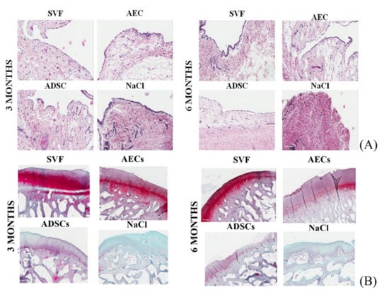 In the worst group (treated with NaCl), there was a reduction in the cartilage staining throughout the thickness, thinning of the CT and increased fibrillation, both at 3 and at 6 months. Additionally, in the ADSC group, cartilage staining was less intense than in the other two groups with reduced CT and increased fibrillation, which worsened at 6 months. It was also noted that CT decreased over time in the SVF group and fibrillation increased over time in the group treated with AECs.