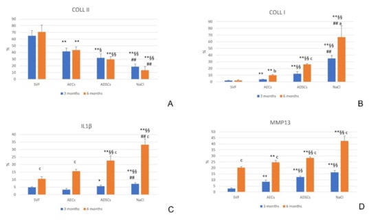 Mean and standard deviation (SD) of immunostaining quantification (%) of Collagen II (COLL II) (A), Collagen I (COLL I) (B), Interleukin 1β (IL1β) (C), and Metalloproteinase 13 (MMP13) (D), for all treatment groups: SVF, AECs, ADSCs and NaCl, at 3 and 6 months. N = 6. *, p < 0.05; **, p < 0.005: SVF vs. AECs, ADSCs and NaCl. §, p < 0.05; §§, p < 0.005: AECs vs. ADSCs and NaCl. ##, p < 0.005: ADSCs vs. NaCl. a, p < 0.05; b, p < 0.005; c, p < 0.0005: 6 months vs. 3 months.