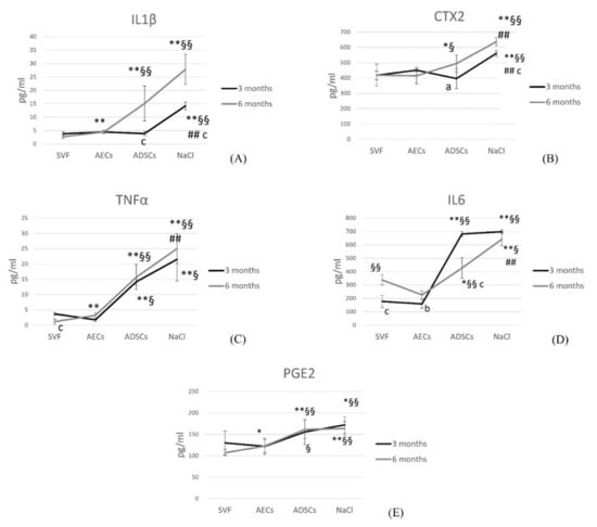 Line graphs of pro-inflammatory cytokine quantification (pg/mL) in the synovial fluid: IL1β (A), CTX2 (B), TNFα (C), IL6 (D), PGE2 (E), in all treatment groups: SVF, AECs, ADSCs and NaCl at 3 (black line) and 6 (grey line) months. N = 6. *, p < 0.05; **, p < 0.005: SVF vs. AECs, ADSCs and NaCl; §, p < 0.05; §§, p < 0.005: AECs vs. ADSCs and NaCl; ##, p < 0.005: ADSCs vs. NaCl. a, p < 0.05; b, p < 0.005; c, p < 0.0005: 6 mo vs. 3 mo.