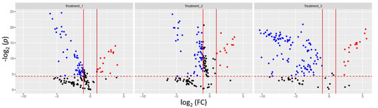 Proteomic changes between treatments are shown in Figure 1. Volcano plots represent DAPs in each treatment; the greatest number was observed in treatment 3, a total of 124 DAPs, while in treatments 1 and 2, the numbers were much smaller, 77 and 70, respectively (Supplementary Material—Table S1, “DAPs” spreadsheet).