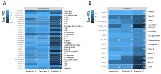 Heat maps show the relative abundance of proteins involved in the immune response (A) and coagulation (B). Each colored box represents the relative abundance of a protein according to the color key. Differentially abundant proteins (DAPs) are indicated with asterisks. IDs column provides protein identifiers (accession numbers of the UniProtKB entries). If an identified protein had no assigned protein or gene name in the UniProt or PANTHER databases (uncharacterized protein), we provided a protein family/subfamily name; d.c.p.—domain-containing protein.