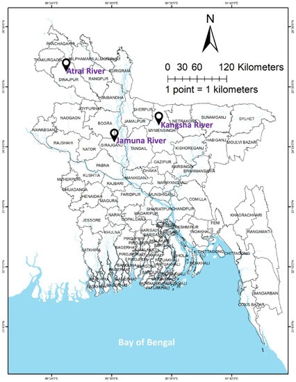 Advanced fry of L. ariza (n ≥ 900) were collected from each of the three river populations of Bangladesh, i.e., the Atrai (Dinajpur District), Kangsha (Mymensingh District), and Jamuna Rivers (Sirajganj District) (Figure 1). The average length (cm) and weight (g) of the fish were 5.89 ± 0.85 cm and 7.08 ± 0.94 g, 5.80 ± 0.73 cm and 7.06 ± 0.91 g, and 5.85 ± 0.92 cm and 7.01 ± 0.86 g, respectively. They were stocked in nine ponds (18 × 14 × 1.3 m each) equipped with inlet-outlet, water exchange, and aeration systems. The fish were subjected to three treatments with three replications each. All experiments were performed in the Field Laboratory Complex of the Faculty of Fisheries, BAU. The fish were reared for six months and were given feed containing 35% protein (Mega Feed Ltd., Dhaka, Bangladesh) twice daily at approximately 5% of their body weight. Major water quality parameters were recorded weekly; temperature was measured using a Celsius thermometer (SMART SENSOR* AR867, Dongguan, China); dissolved oxygen was measured using a dissolved oxygen meter (DO-5509, Lutron, Taipei, Taiwan), and ammonia was measured using ammonia test strips (Indigo instruments, Waterloo, ON, Canada); nitrite, alkalinity, hardness, chlorine, and pH were measured using water test strips (Thomas Scientific, Swedesboro, NJ, USA).
