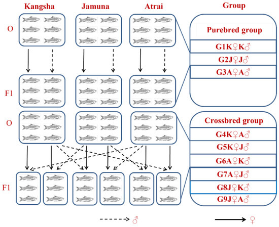 Inter- and intra-species ordination of different sample populations of Ariza labeo (L. ariza) to propagate and procreate F1 generation. The single words picked for naming the purebred and crossbred groups bear the full forms as G → Group, K → Kangsha River stock, J → Jamuna River stock and A → Atrai River stock.
