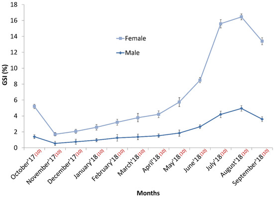 The GSI, a metric representing the relative weight of the gonad to the fish body weight, was determined over a period of 12 months for mature fish. Year-round (between October 2017–September 2018) GSI data was collected following the sacrifice of three males and three females [37] in every month using the following formula: