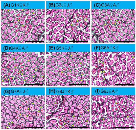 Muscle morphometrical variation of different crossbred groups of Ariza labeo (L. ariza) F1 generation. [(A), (B), (C), (D), (E), (F), (G), (H) and (I) represent G1K♀K♂, G2J♀J♂, G3A♀A♂, G4K♀A♂, G5K♀J♂, G6A♀K♂, G7A♀J♂, G8J♀K♂, and G9J♀A♂ groups, respectively. The single words picked to name the purebred and crossbred groups bear the full forms as G → Group, K → Kangsha River stock, J → Jamuna River stock and A → Atrai River stock. Recruited myofibers (hyperplastic) are smaller (yellow arrowheads indicated) situated between the medium and large diameter muscle fiber (red asterisk mark indicated)]. Scale bar = 50 µm.