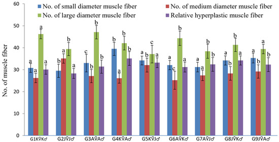 A mosaic pattern distribution of fibers (with fibers of various diameters) was observed in transverse sectional trunk skeletal muscle histology (Figure 4). Small, medium, and large—for all diameter classes of fiber, each group was identical, and a significant difference was found between all groups. G4K♀A♂ was the highest ranked group where the mean number of small-diameter fibers derived from hyperplastic action was recorded more than those in the other groups (Figure 5).