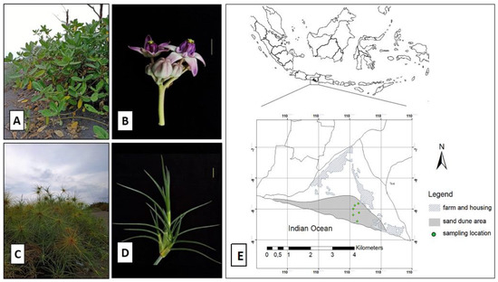 Halophyte habitats and sampling locations. (A) Calotropis gigantea at Parangkusumo sand dune and (B) its flowering part. (C) Spinifex littoreus at Parangkusumo sand dune and (D) its leaf morphology. (E) Six sampling locations across Parangkusumo sand dune area.