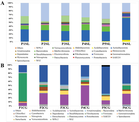 Bacterial taxonomic composition and relative abundance at phylum level. (A) Relative abundance of bacteria associated with the root of S. littoreus across six different sampling populations at phylum level. (B) Relative abundance of bacteria associated with the root of C. gigantea across six different sampling populations at phylum level. Abbreviations of sampled populations: P—Population (Population 1 to 6, P1 to P6), CG—C. gigantea, SL—S. littoreus.